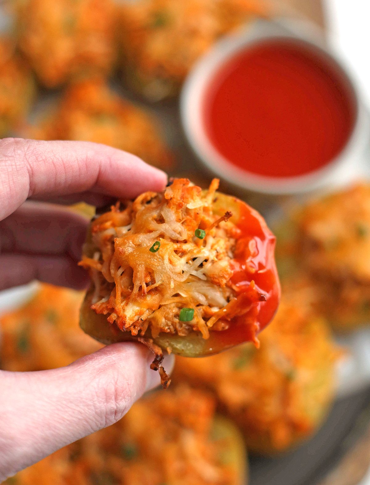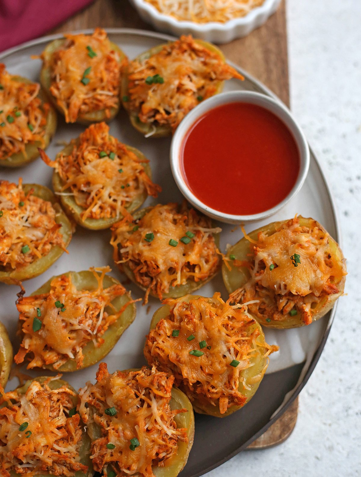 These potato skins are a really fun take on the classic buffalo wings flavors. Using small potatoes makes them just a couple bites, meaning they can be an appetizer or a meal, depending on how many you want to have. They can be prepped ahead and warmed the day of serving. Add to your next game day menu or gathering with friends and everyone will love them!