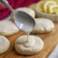 - Make glaze- in a small bowl combine the powdered sugar and lemon juice until smooth. Spoon over each cookie. It will harden as it cools.