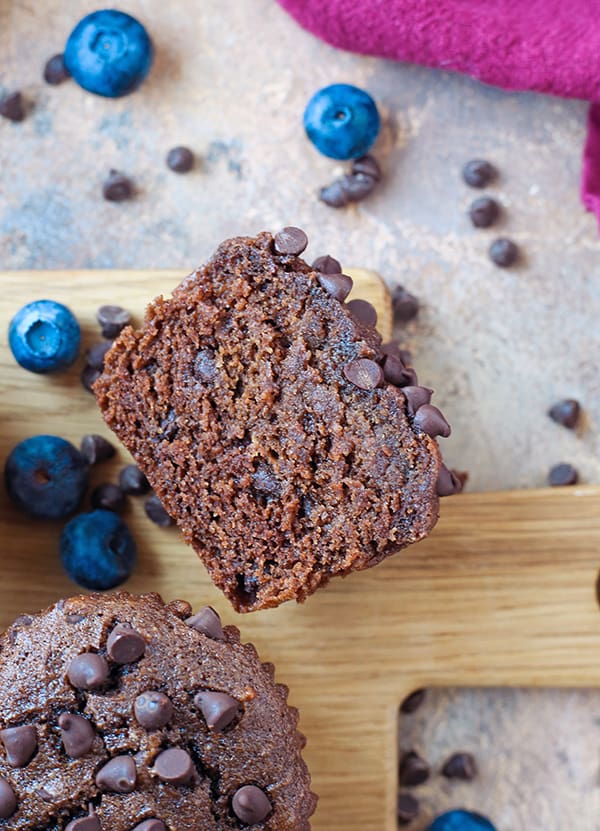 These muffins are like a cross between a rich, dense brownie and a moist, tender muffin. The texture is absolutely perfect and they are not cakey or dry at all. They have cacao powder and chocolate chips which means double chocolate-y goodness. They are sure to become a favorite!