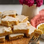 Spread 1 cup of lemon curd evenly on the cooled crust and top with remaining shortbread. The best way to do this is to press the dough on a piece of wax paper into the size of the pan and then flip it on top of the lemon layer. Press any pieces together that come apart. Bake for 23-25 minutes, until golden brown around the edges. Let cool before frosting.