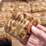 Top evenly with apple mixture and then crumb mixture on top of the apples. Place in the oven and bake 40 minutes. Let cool before glazing.