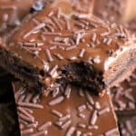 Once cool, make the frosting. In a small saucepan combine the chocolate chips with the cashew butter and stir over medium heat until smooth. Pour over the bars and then top with sprinkles if desired. Place in the fridge to set.