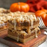 Once the base is cooked let cool 5 minutes. Then pour the pumpkin mixture on top, top with remainging shortbread as the crumb topping and bake 25 more minutes.