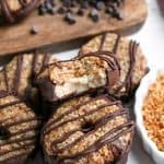 Blend the dates (drain first), SunButter, and vanilla a minute or two until combined. It won't be smooth. Add in the coconut and blend again until combined. Mixture will be thick. Divide the mixture into 11 portions, about 1 tablespoon each. Roll into balls and press down into the same size as the shortbread. Poke a hole in the center with the back of the wooden spoon and place on top of the shortbread. Gently press the two layers together. Place in the fridge for 1-2 hours.